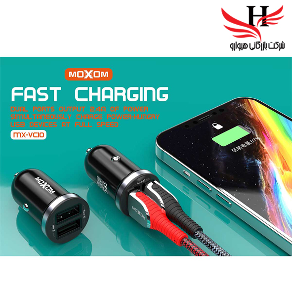 شارژر فندکی دو پورت Moxom مدل MX-VC10 با اتصال به محل فندک خودرو مناسب جهت شارژ گوشی و انواع گجت های هوشمند در ماشین میباشد که درگاه خروجی USB با شدت جریان کلی 2.4 آمپر است.