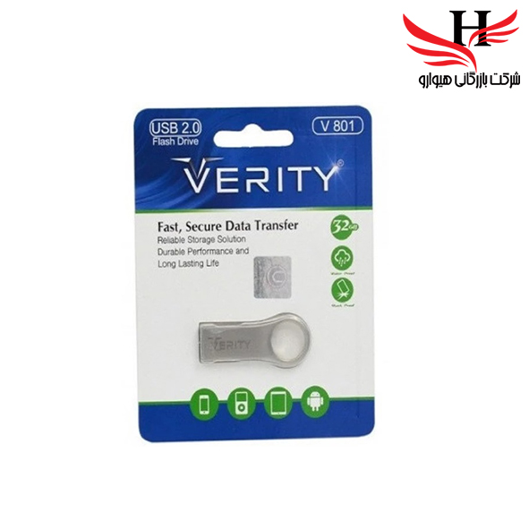 فلش VERITY V801 از شرکت وریتی دارای بدنه ای از پلاستیک مقاوم می باشد و حتی پورت USB آن نیز داخل این بدنه تعبیه شده است تا در برابر خمیدگی حداکثر محافظت از آن به عمل آید. دیگر ویژگی های این فلش در برابر آب، گرد و غبار مقاوم طراحی شده است. در کنار این مموری برای راحت تر شدن حمل آن و هم چنین کاهش احتمال گم شدن یک بند آویز در نظر گرفته شده است تا شما آن را به دسته کلید خود متصل نمایید.ازاین فلش مموری می توان جهت جابه جایی اطلاعات میان سیستم ها، تماشای فیلم در نمایشگر ها، گوش دادن به موسیقی در پلیرها و … استفاده نمایید.