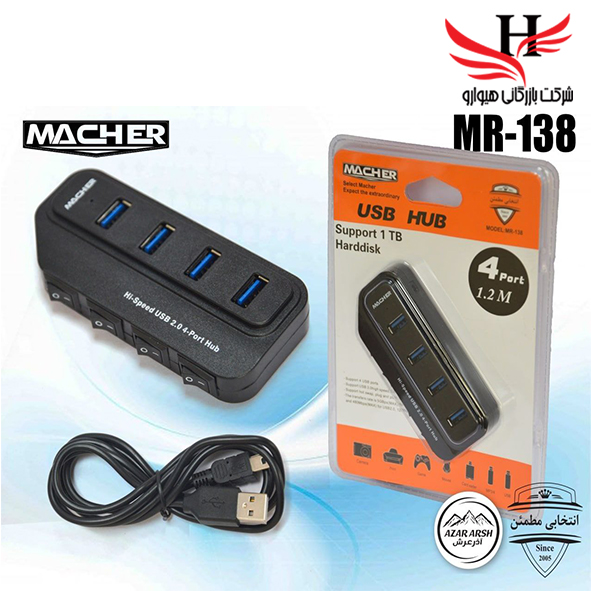 هاب یو اس بی (USB Hub) یکی از ابزارهای جانبی نسبتا پرکاربرد رایانه های شخصی است، که به کاربر امکان میدهد چند وسیله جانبی مختلف را به یک پورت USB وصل کند. این ابزار به خصوص برای کسانی که مادربورد رایانه شان تعداد پورت کمی دارد و یا از لپ تاپ استفاده میکنند، بسیار مفید و شاید هم ضروری است. هاب MR-138 محصولی از شرکت مچر Macher بوده و دارای ۴ پورت یو اس بی می باشد، که به وسیله آن می توان همزمان چهار دستگاه مختلف مانند فلش مموری، گوشی موبایل، تبلت و غیره را به لپ تاپ و یا کامپیوتر متصل نمود. هاب Macher MR-138 دارای ابعادی کوچکی می باشد که به راحتی دورن کیفتان و یا میز کارتان جای میگیرد، تا هر زمان که به آن نیاز داشتید بتوانید به راحتی از آن استفاده نمایید.
