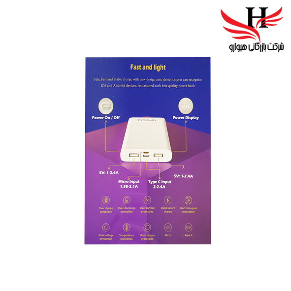 پاور بانک فست شارژ وکو با بهره گیری از تکنولوژی روز دنیا و با استفاده از باتری لیتیوم - پلیمری با قابلیت تشخیص اتوماتیک خروجی تولید گردیده است. دارای دو ورودی microUSB و Type C میباشد. دارای دو خروجی فست شارژ همزمان USB میباشد.