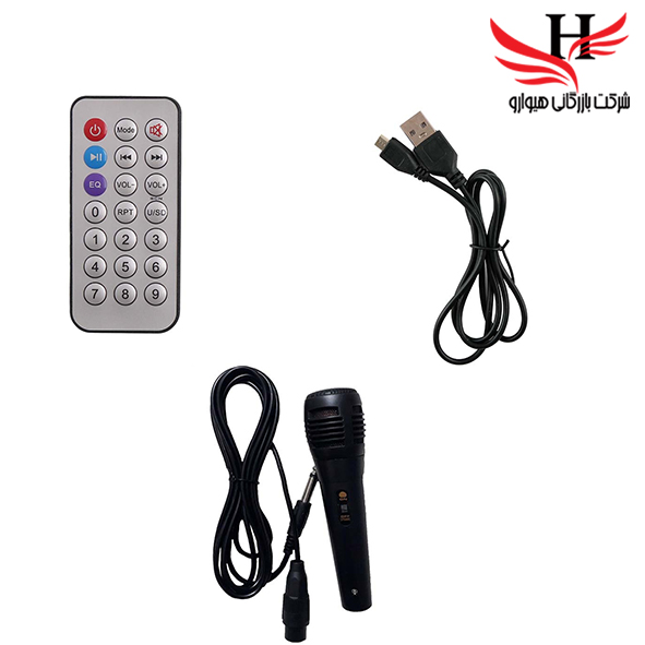 بند آویز اسپیکر, دفترچه راهنما, ریموت کنترل, کابل شارژ, میکروفون